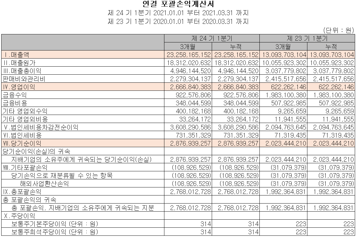 당사의 2021년 1분기 실적은 매출액 233억 원으로 전년 동기 대비 77.6% 증가했고, 영업이익은 27억 원으로 328.6% 증가, 당기순이익인 42.2% 증가한 29억 원을 기록했습니다.