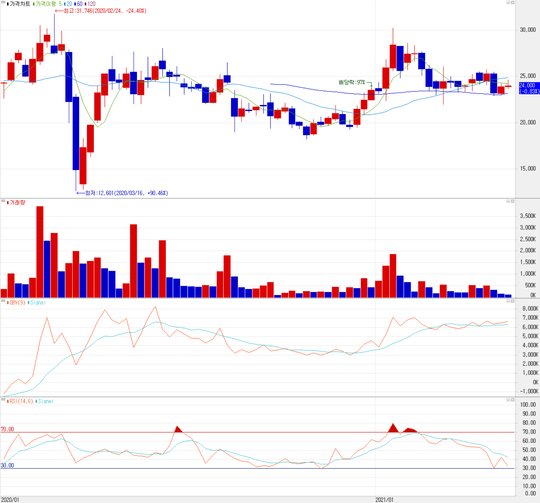 지난 3월 중 관계기업 탑머티리얼에 대한 지분 투자 확대로 최대주주가 되면서 주가가 반등 시도를 했으나 시장 수급 둔화 등 변동성에 따른 하락이 있었고 최근에는 24,000원 부근에서 움직이고 있습니다. 최근 수급에서는 6 거래일 연속 순매수 중인 가운데, 외국인도 매수 우위를 보이고 있는 반면 개인은 소극적인 모습입니다. 차트 소견 상 개인적인 목표주가는 지난번 30,000원에서 28,000원으로 일부 조정하면서 단기 대응 전략을 고려 중입니다. 추가 하락 시에는 23,000원을 지지하고 반등할 때 매수 시기를 고려할 생각입니다. 주 고객사의 투자에 따른 수주 상황과 탑머티리얼즈 실적 및 양극재 개발 과정이 당사의 중장기 주가를 결정할 것으로 생각됩니다.