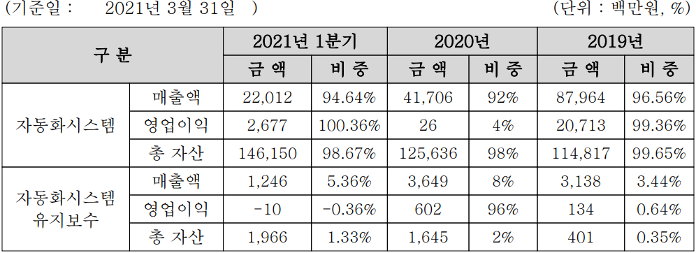 반도체 및 디스플레이 Clean 자동화 시스템 영역으로 확대, 자율 주행 무인 운반 시스템(AGV)을 통한 스마트 팩토리 사업 강화 등 지난 2020년 당기말 기준 분석 내용 외 특이 사항 없습니다. 2021년 3월 자산 취득으로 (주)탑머티리얼의 최대주주가 되었으므로 향후 전기차용 코발트 프리(Cobalt Free) 양극재의 개발 과정 등 관계기업의 동향도 꾸준한 모니터링이 필요하겠습니다.