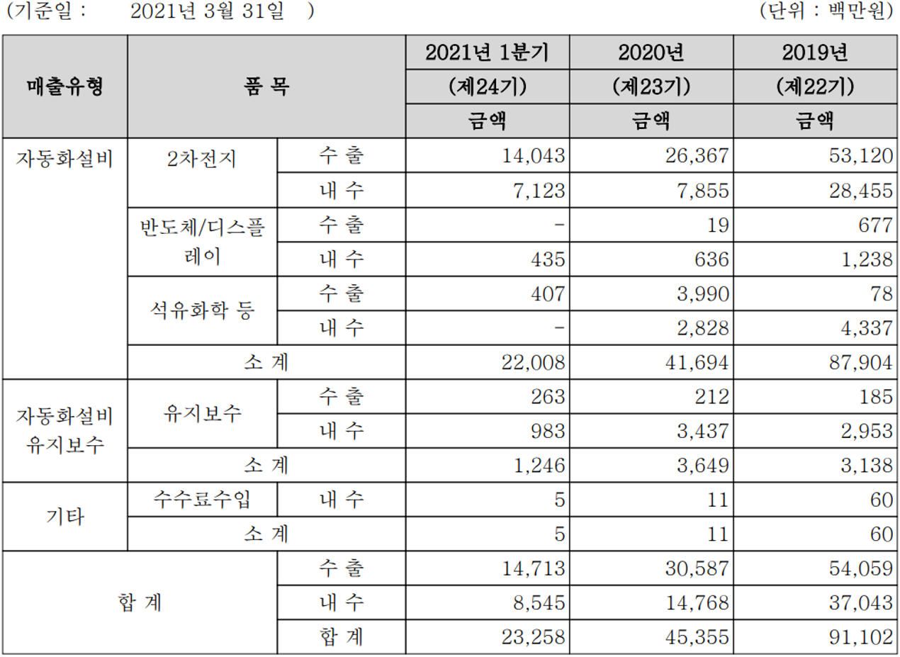 당사는 2차전지, 반도체 및 디스플레이, 석유화학 분야 등의 물류 자동화 설비를 제조, 공급하는 사업으로 구분됩니다. 지난해 자동화 설비 부문 매출은 전체 매출의 96.56%를 차지하였으며, 기타 시스템의 유지보수 매출이 차지하고 있습니다.