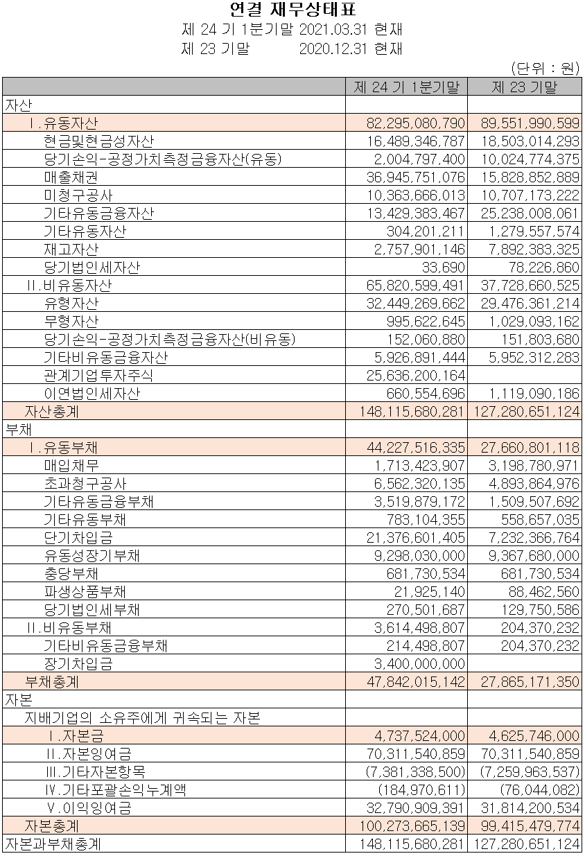 2021년 1분기 재무 안정성 비율에서는 유동비율 186.1%, 부채비율 47.7%, 자기자본비율 67.7%, 자본유보율 2,176.3%를 기록하였습니다. 관계기업 투자로 부채비율이 증가하면서 유동성이 하락했지만 1분기 말 현재 여전히 좋은 재무상태를 유지하고 있습니다.