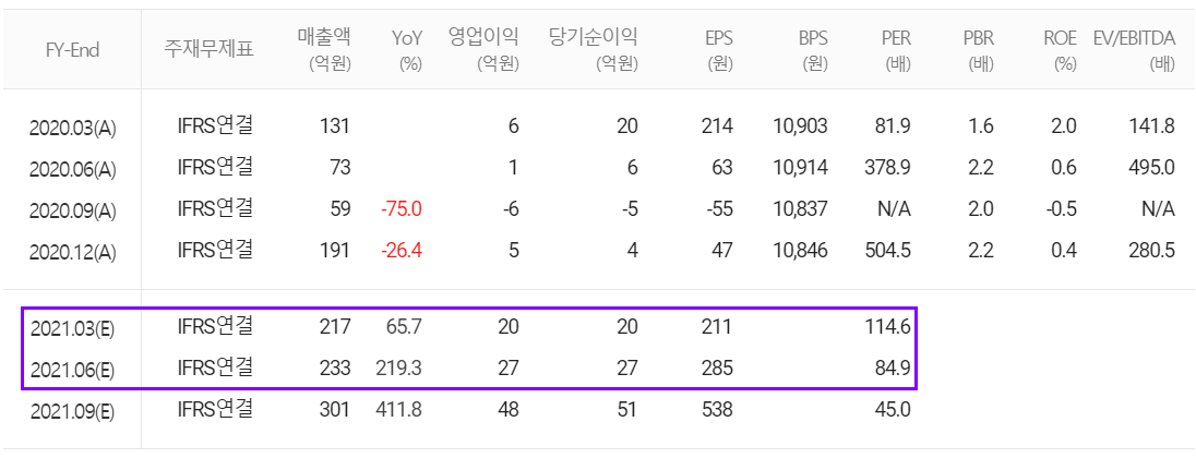 연간 컨센서스로는 매출액 1,082억 원을 추정했으나, 지난 3월 세계 최초로 '코발트 프리 양극재'를 개발한 탑머티리얼의 최대 주주로 올라서는 등 탑머티리얼의 매출도 상당 부분 기여할 것으로 판단되기 때문에 올해 연 매출에 대한 개인적인 예상은 1,300억 원 안팎으로 예상하고 있습니다. 다만 당사는 연결재무제표에 미치는 영향이 중요하지 않기 때문에 1분기 연결대상에서 제외한다고 밝혔고, 향후 상황에 따른 포함 여부를 결정할 것으로 판단됩니다. 아무튼 컨센서스 기반으로 2021년 1분기 매출액은 217억 원을 추정하였고, 실제 매출은 16억 원 많은 233억 원을 기록하였습니다. 2분기 매출액은 233억 원으로 전년 동기 대비 219.3% 증가할 것으로 내다봤습니다. 코로나19로 인한 사업 지연으로 기저효과 때문인 것으로 풀이됩니다.