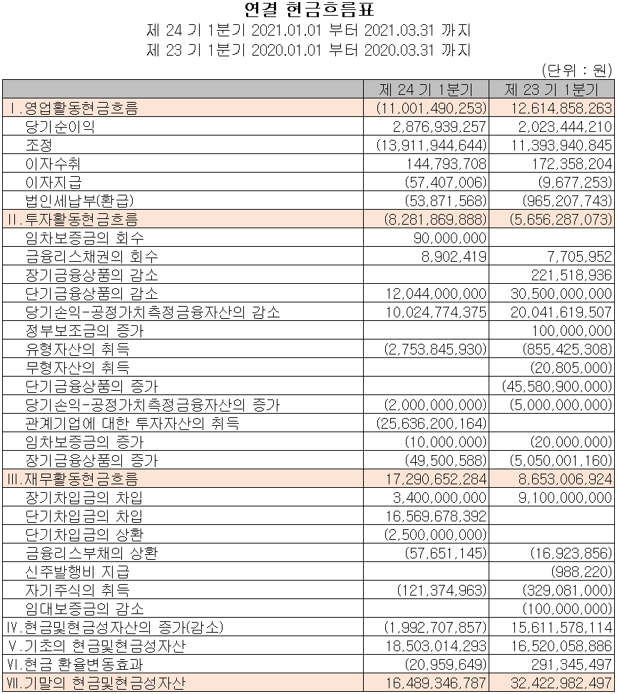 지난해 영업활동으로 인한 현금흐름에서는 전기 대비 매출 채권이 208억 원 감소하면서 총 110억 원의 현금흐름이 유출되었습니다. 투자활동에서는 (주)탑머티리얼 투자주식 등 전반적으로 82억 원의 유출이 있었고, 차입금을 조달하여 부채의 상환 및 자기주식을 취득하였습니다. 2021년 3분기 말 기준 현금 및 현금성 자산은 165억 원입니다.