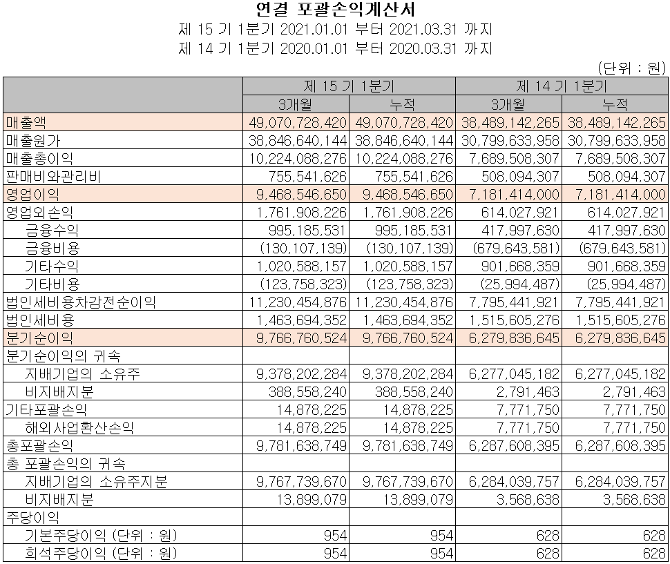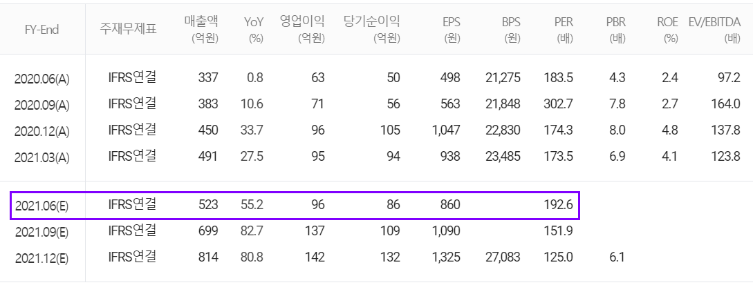 당사의 2021년 2분기 예상 실적은 매출액 523억 원으로 전년 동기 대비 55.2% 증가하고, 영업이익은 96억 원으로 52.3%, 당기순이익 86억 원으로 72% 증가할 것으로 추정했습니다.