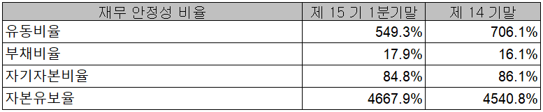 2021년 1분기 재무 안정성 비율에서는 유동비율 549.3%, 부채비율 17.9%, 자기자본비율 84.8%, 자본유보율 4,667.9%로 건실하고 안정적인 재무상태를 유지하고 있습니다.