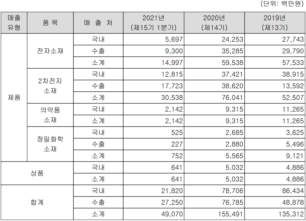 당사의 사업부문에는 반도체 및 디스플레이 화학 소재를 제조하는 전자소재, 2차전지 전해액 소재, 의약품 중간체 그리고 정밀화학 분야에 적용되는 소재로 구성되어 있습니다. 지난 1분기 전자소재 부문에서의 매출은 전체 매출의 30.6%를 차지했고, 2차전지 62.2%, 의약품 소재 4.4% 등의 매출 비중을 나타냈습니다.
