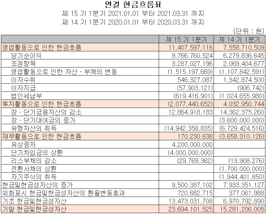 지난 1분기 영업활동 현금흐름은 순이익의 증가 등으로 인해 전년 동기 대비 38억 원 증가한 114억 원의 현금이 유입되었습니다. 유상증자(420억 원)로 자금을 조달하여 유형자산을 취득하고, 부채를 상환했습니다. 2021년 1분기 말 기준 현금 및 현금성 자산은 전년 동기 대비 84억 원 증가한 237억 원입니다.