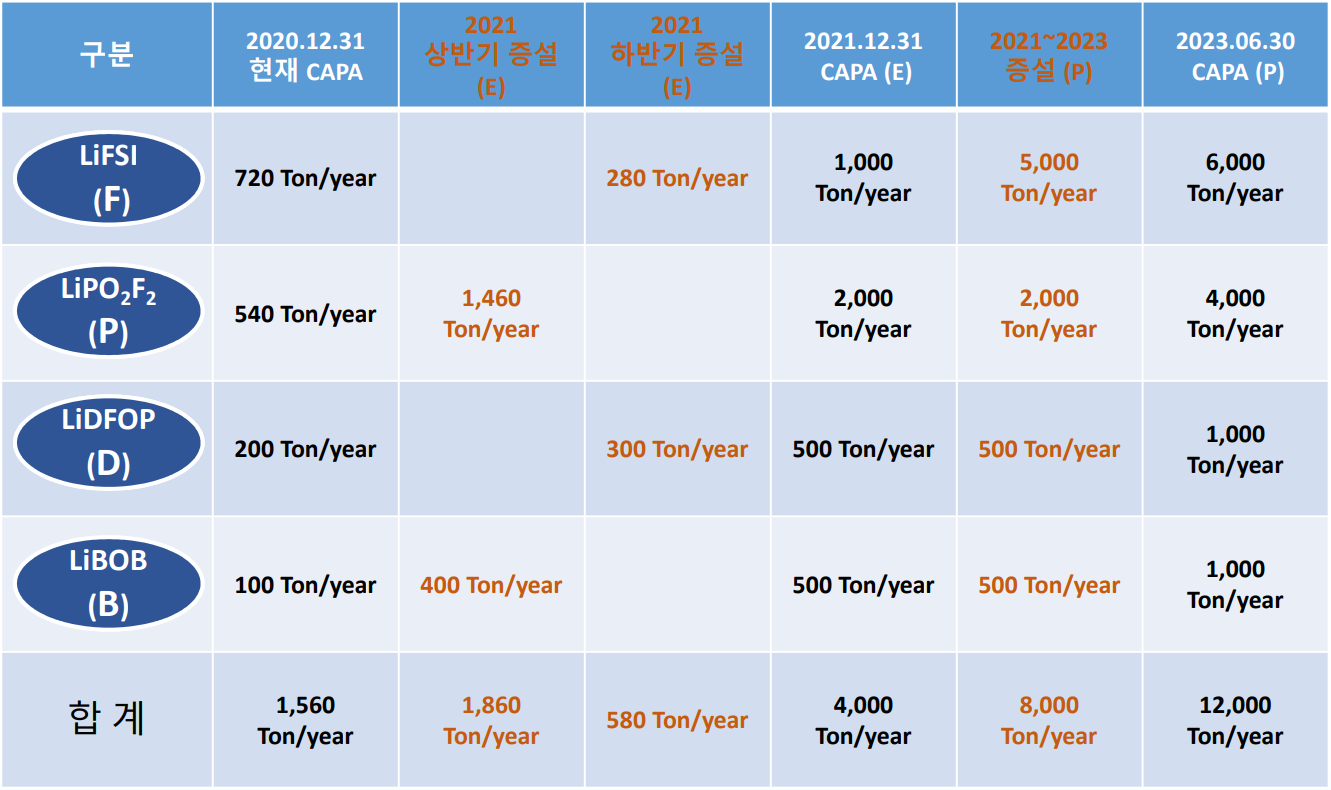당사의 2차전지 전방 산업의 수요에 대응하기 위한 전해질 설비 증설 계획입니다. 올해 상반기 이미 1,460톤 규모의 LIPO2F2(P 전해질) 설비 증축을 완료한 상태이며 B 전해질도 증설 중에 있는 것으로 파악됩니다. 또한 하반기에도 총 580톤의 증설이 계획되어 있고 2023년까지 올해 상반기 대비 6.5배에 가까운 지속적인 설비 증설을 계획하고 있습니다. 좀더 자세한 사항은 본글 하단의 IR 자료를 참조하시기 바랍니다.
