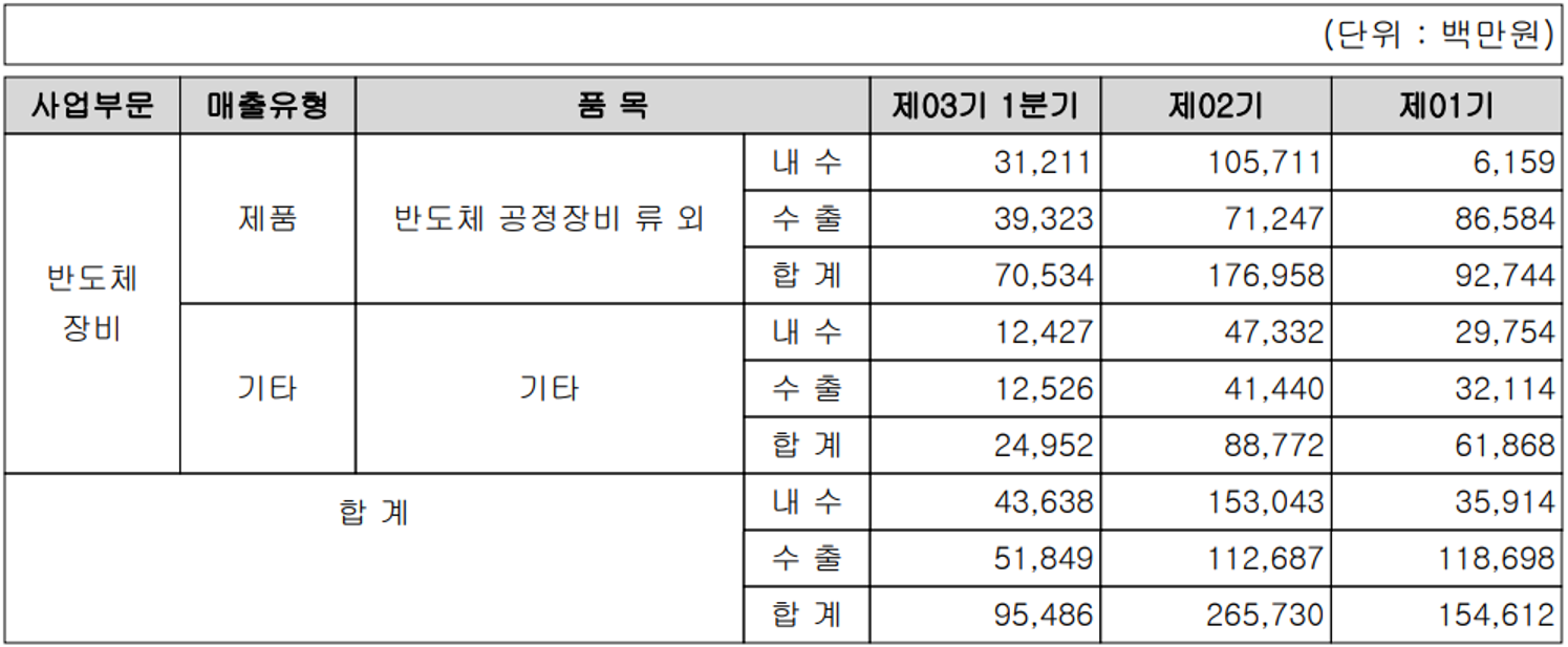 반도체 공정용 장비 매출에서 내수는 44.2%, 수출 55.8%의 비중을 보였고, 기타 부문에서는 내수 49.8%, 수출 50.2%의 비중을 기록했습니다.