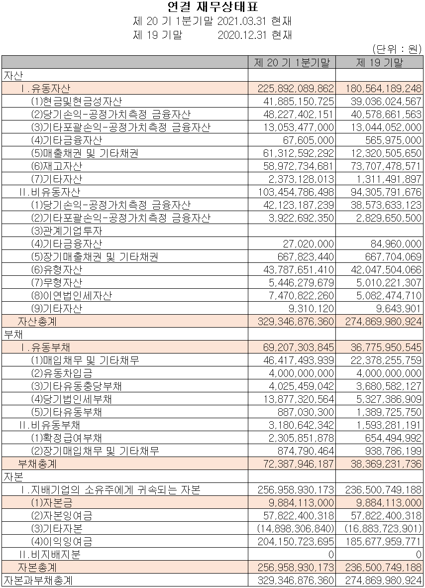 2021년 1분기 말 기준 자산총계는 전기보다 19.8%(545억 원) 증가한 3,293억 원으로 실적 증가에 따른 매출 채권의 증가가 주요 요인입니다. 부채는 88.7%(340억 원) 증가한 724억 원으로 매입채무의 증가에 기인합니다.
