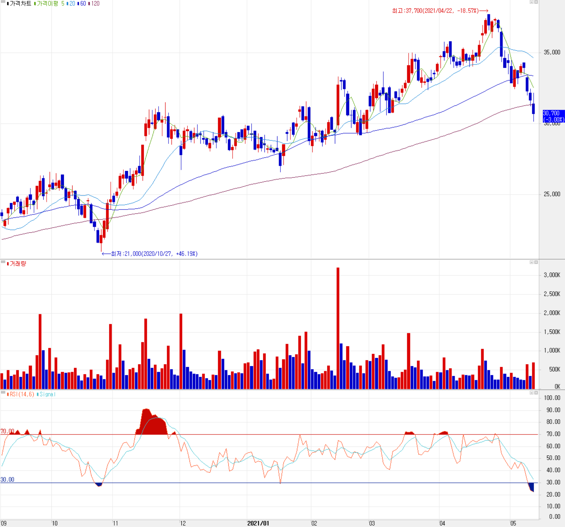 지난해 10월말 이후 반도체 슈퍼사이클 도래에 따른 관련주로서 당사의 주가도 꾸준히 상승하면서 지난 4월 22일 최고가인 37,700원을 기록한 후 시장 수급 변동과 미국발 인플레이션 우려로 증시가 충격을 받으면서 강한 조정을 받고 있습니다. 현재 주가는 이평선 아래 위치하고 있으며, 최근 기관의 매물을 개인이 받아내고 있는 모습이지만, 전반적인 시장의 수급을 이기지 못하는 상황입니다.