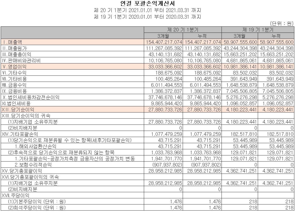 지난 1분기 영업활동 현금흐름은 순이익의 증가 등으로 전년 동기 대비 36억 원이 증가한 114억 원의 현금이 유입되었습니다. 정부보조금을 수령하였고, 미지급금에 대한 상환이 있었으며, 유동/비유동 당기 손익 인식 금융자산의 처분과 취득 등에 따른 투자활동으로 88억 원의 현금 유출이 있었습니다. 2021년 1분기 말 기준 현금 및 현금성 자산은 전년 동기 대비 58억 원이 증가한 419억 원입니다.