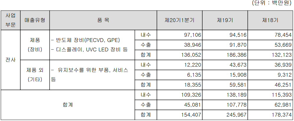 당사는 반도체 및 디스플레이, UVC LED의 제조 공정용 장비를 제조, 공급하는 사업을 영위하고 있으며, 이중 반도체 관련 장비의 매출이 전체 매출의 90% 이상을 차지하고 있습니다. 지난 1분기 당사의 반도체 및 디스플레이 등 장비 매출은 전체 매출의 88.1%인 1,361억 원을 차지하였고, 기타 유지보수용 부품 및 용역 서비스가 11.9%로 184억 원을 기록했습니다.