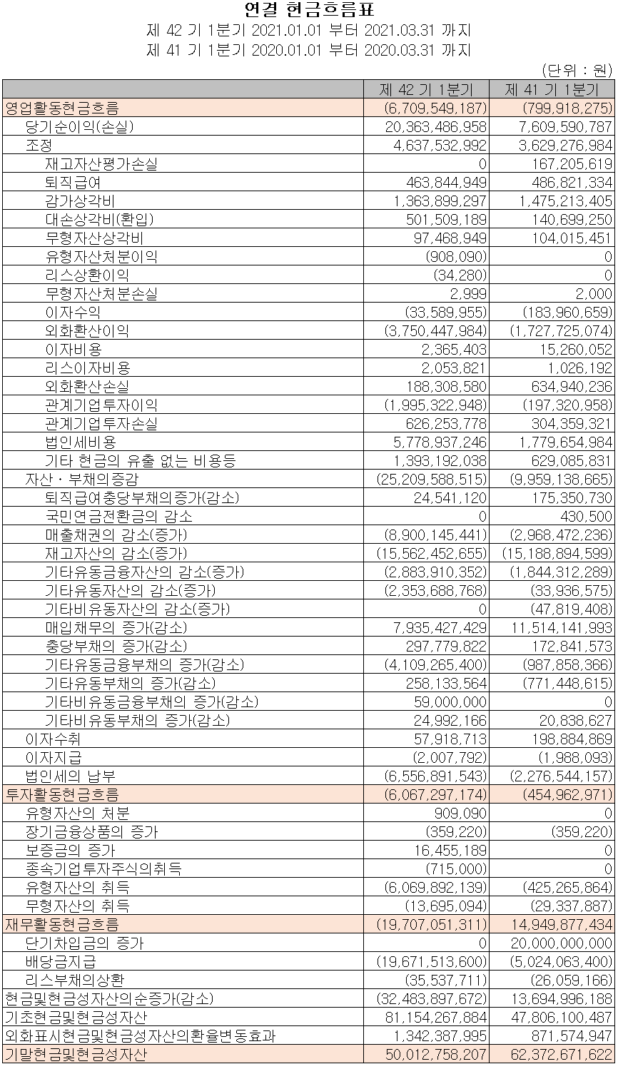 지난 1분기 영업활동 현금흐름에서는 외화환산 손실, 관계기업 투자 손실 등의 반영으로 67억 원의 현금이 유출되었습니다. 배당금을 지급하였고, 부채의 상환을 했으며 유무형 자산을 취득하였습니다. 2021년 1분기 말 기준 현금 및 현금성 자산은 전년 동기 대비 124억 원 감소한 500억 원입니다.