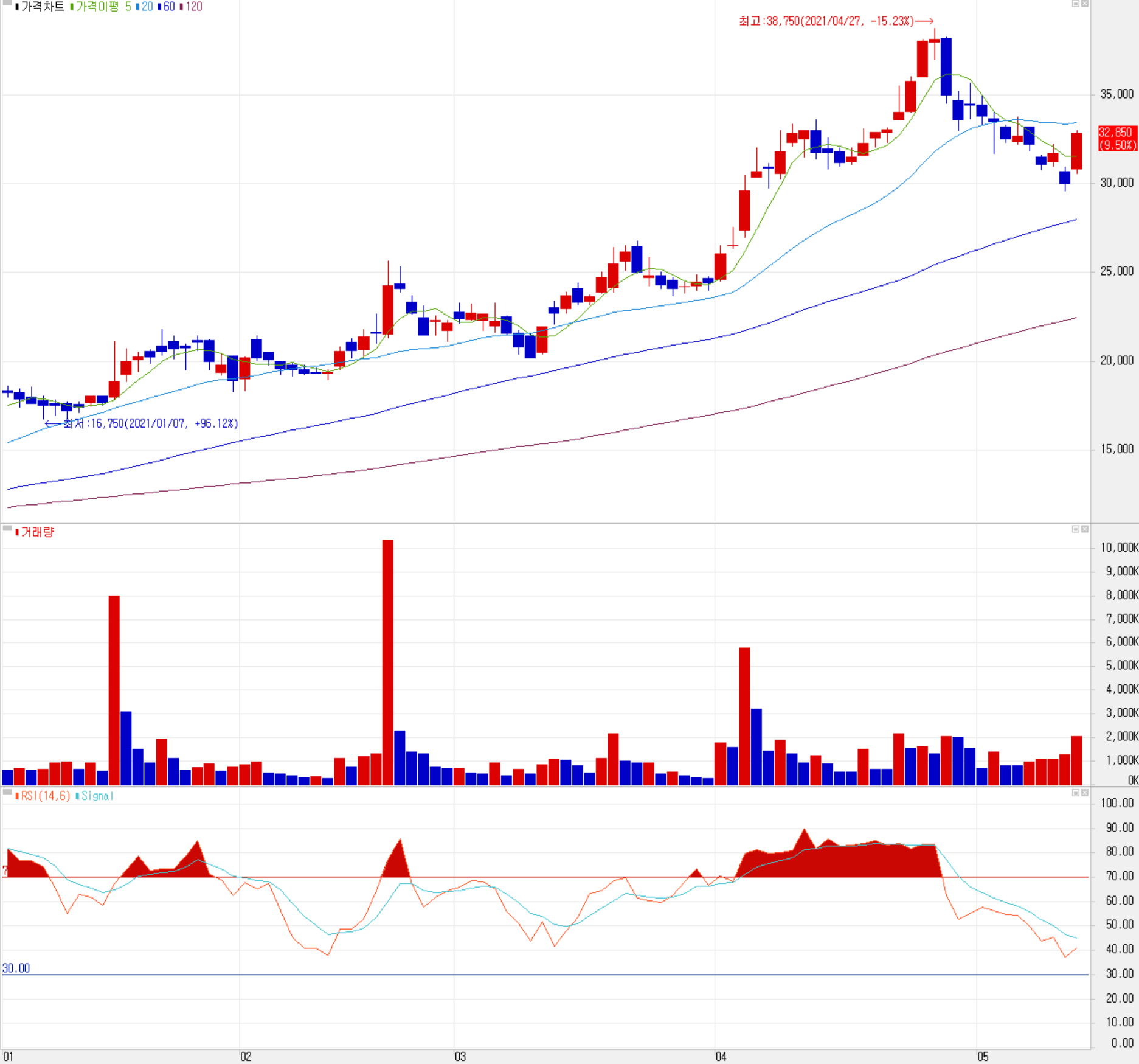 당사의 주가는 지난해 3월 코로나19로 인한 급락 후 완만한 상승을 하면서 회복했으나, 11월 들어서면서 반도체 슈퍼사이클 도래와 함께 급격한 상승을 시작한 후 지난 4월 27일 최고가인 38,750원을 기록한 이후 조정을 받았습니다. 지난 분석에서 설정한 목표주가 39,000원은 유효하지만 오늘은 정부의 'K-반도체 전략' 발표에 따른 상승으로 다음 주 추이를 지켜봐야겠습니다. 최근 수급에서는 6 거래일 연속 순매수하던 개인이 오늘 상승으로 인해 매도로 돌아서면서 이익 실현하는 모습을 보이고 있습니다. 지난번과 같이 하락 조정 시 1차 지지는 29,000원으로 보고 있습니다.