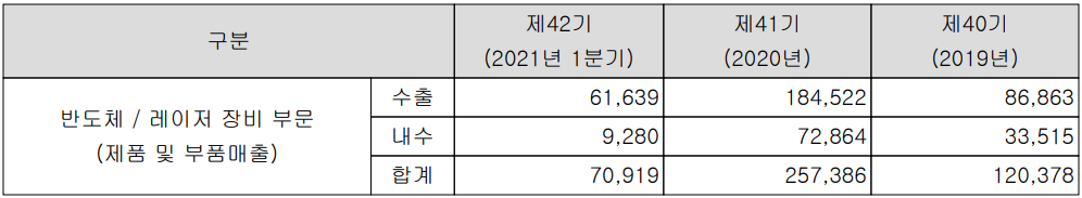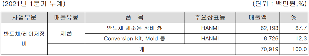 당사는 반도체 산업을 기반으로 한 반도체 제조 공정용 장비 및 레이저 기술 기반의 장비를 생산, 공급하고 있습니다. 지난 1분기 반도체 제조 및 레이저 장비의 매출은 622억 원으로 전체 매출의 87.7%를 차지하였고, 기타 Conversion Kit, Mold 등의 부품류가 87억 원으로 12.3%의 비중을 나타냈습니다.