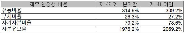 2021년 1분기 재무 안정성 비율에서는 유동비율 314.9%, 부채비율 26.3%, 자기자본비율 79.2%, 자본 유보율 1,976.2%를 기록하면서 건실하고 안정적인 재무상태를 유지하고 있습니다.