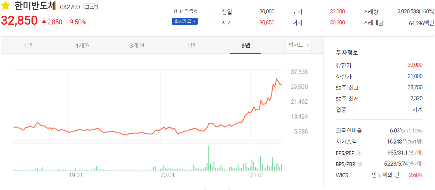 5월 14일 장 종료 기준 당사의 주가는 전 거래일 대비 9.5% 오른 32,850원에 거래를 마쳤습니다. 외국인 비중은 6.03%이며, 시가 총액 1조 6,248억 원으로 코스피 시총 상위 161위 종목입니다.
