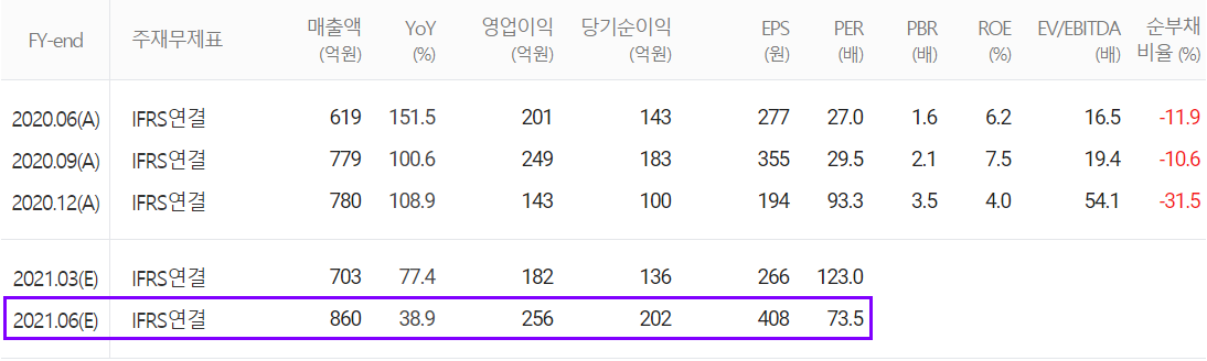 지난 1분기 실적은 컨센서스 대비 매출액 0.8%, 영업이익 6%, 당기순이익 50% 상회하는 실적을 거두었습니다. 2021년 2분기 예상 실적은 매출액 860억 원으로 전년 동기 대비 38.9% 증가하고, 영업이익은 256억 원으로 27.4% 증가, 당기순이익은 202억 원으로 41.3% 증가할 것으로 추정했습니다.