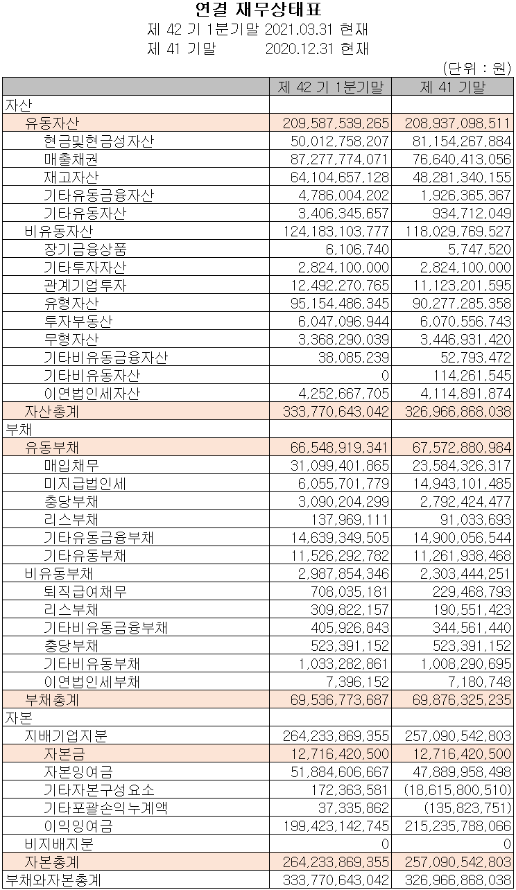 지난 1분기 자산총계는 전기 대비 2.1%(68억 원) 증가한 3,338억 원으로 매출 증가에 따른 매출채권과 재고자산의 증가가 주된 요인입니다. 부채는 0.5%(3억 원) 감소한 695억 원을 기록했습니다.