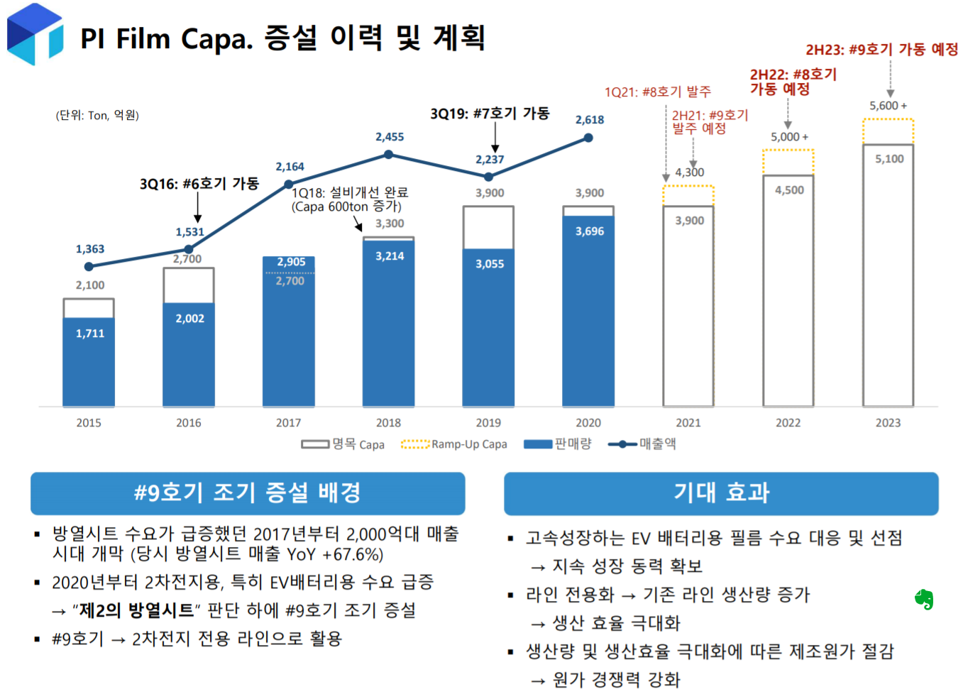 당사는 지난 4월 26일 공시를 통해 전기자동차 등 2차전지에 적용되는 차세대 PI Film 생산을 위한 전용 공장을 증설한다고 밝혔습니다. 증설 규모는 연간 600톤 규모이고,  2021년 4월 27일 공사를 시작하여 2023년 12월 31일 종료 예정입니다.