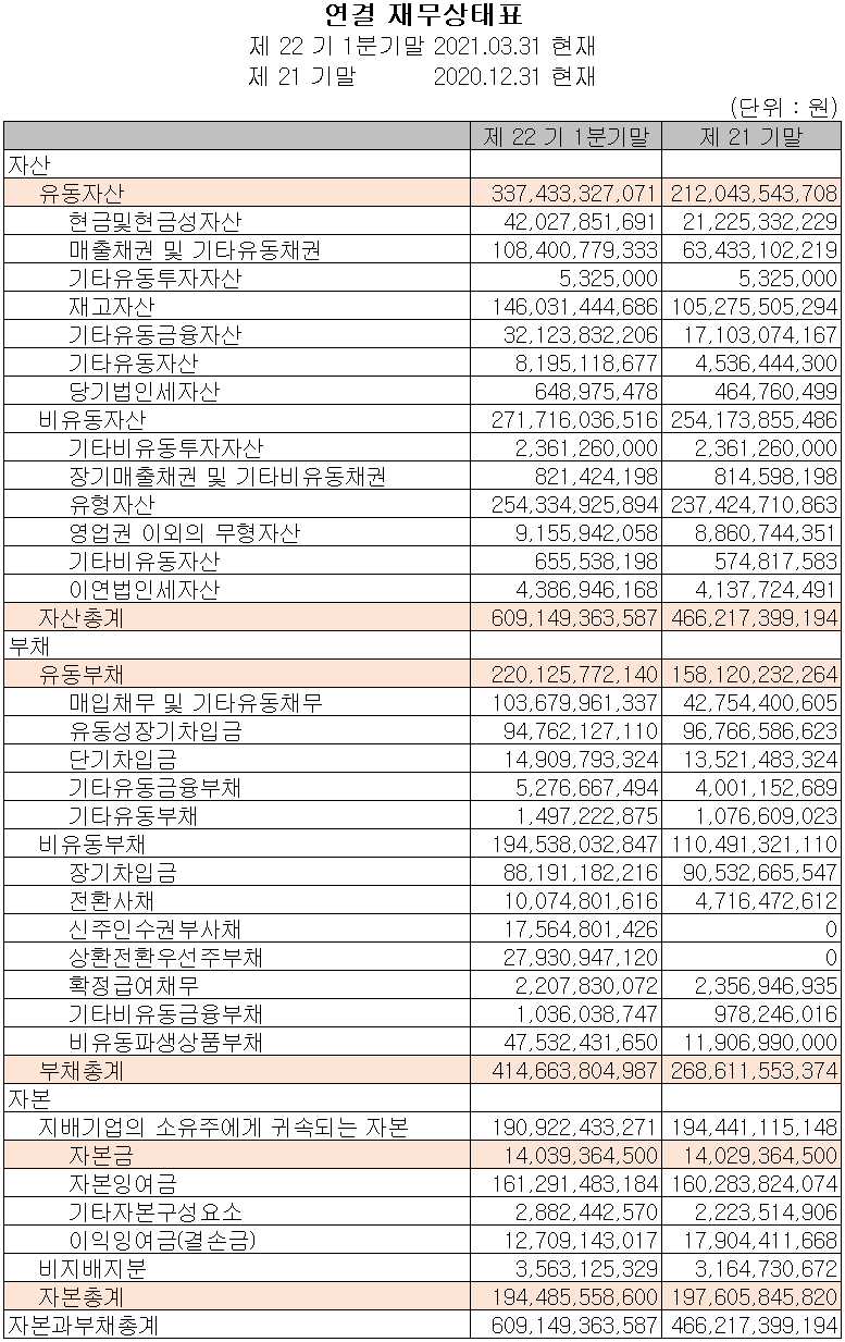 지난 1분기 자산총계는 전기 대비 30.7%(1,429억 원) 증가한 6,091억 원으로 현금 및 현금성 자산의 증가, 매출 증가에 따른 매출 채권의 증가, 유형 자산의 증가 등이 주요 자산 증가의 요인입니다. 부채는 54.4%(1,460억 원) 증가한 4,147억 원으로 매입채무와 사채의 증가에 기인합니다.