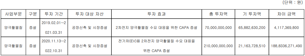 당사는 지난 2019년 700억 원 규모의 양극재 생산 설비 증설에 대한 투자 계획을 세운 후 지난 1분기 완료했으며, 지난 2020년 11월 다시 2,100억 원 규모의 증설 계획을 세우면서 총 2,800억 원 규모의 설비 증가를 계획했습니다.