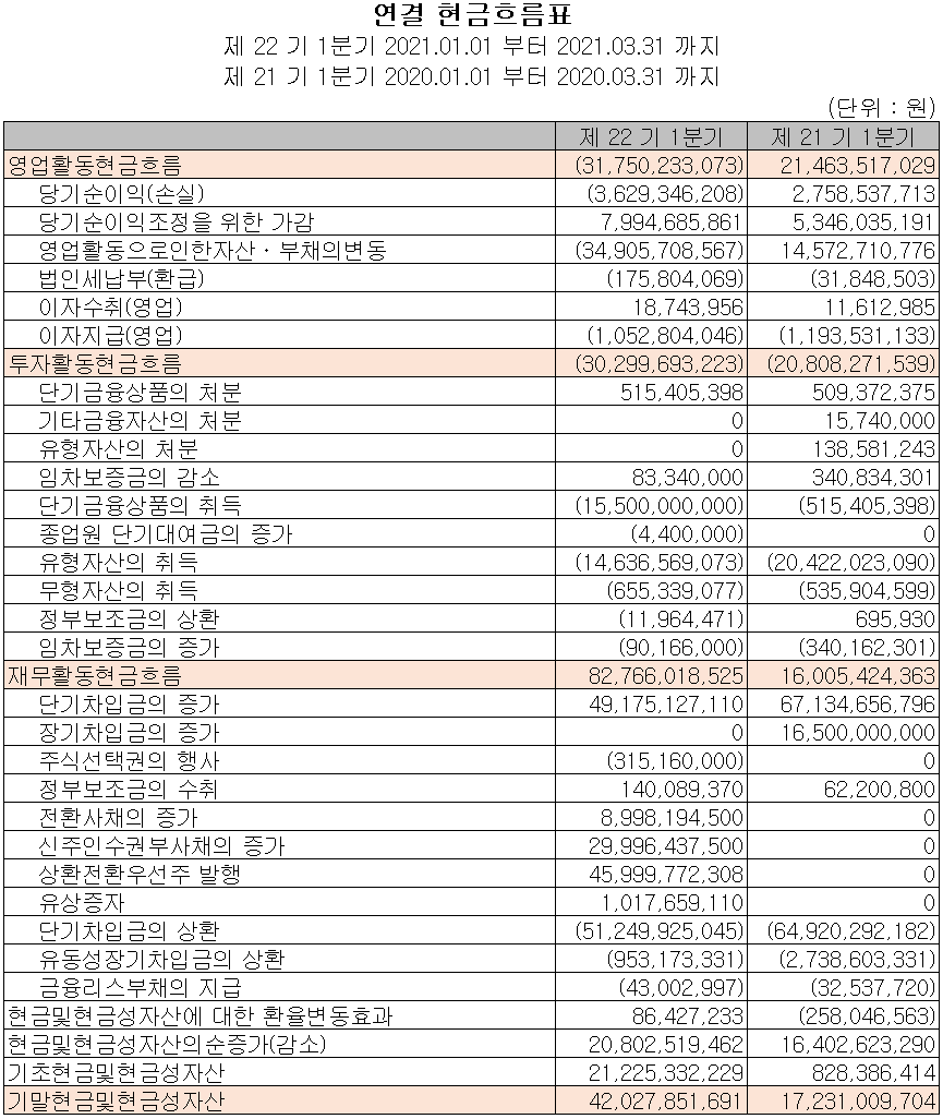 당사의 지난 1분기 영업활동 현금흐름은 당기순손실, 영업활동으로 인한 부채의 증가로 총 318억 원의 현금이 유출되었습니다. 차입금을 조달하였고 정부보조금을 수취하여 생산능력 증대를 위한 유무형 자산에 투자활동을 지속하고 있습니다. 2021년 1분기 말 기준 현금 및 현금성 자산은 420억 원입니다.
