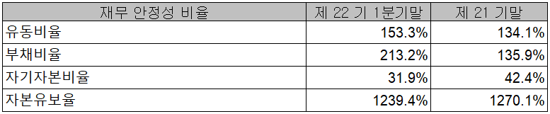 당사의 2021년 1분기 재무 안정성 비율에서는 유동비율 153.3%, 부채비율 213.2%, 자기자본비율 31.9%, 자본 유보율 1,239.4%를 기록했습니다. 전기차 향 전방산업의 급속한 수요 증가에 따른 설비 투자로 인해 부채비율도 비례하여 증가하고 있으나 점차 생산능력, 수요 예측과 컨센서스 기반하면 점차 개선될 것으로 판단됩니다.