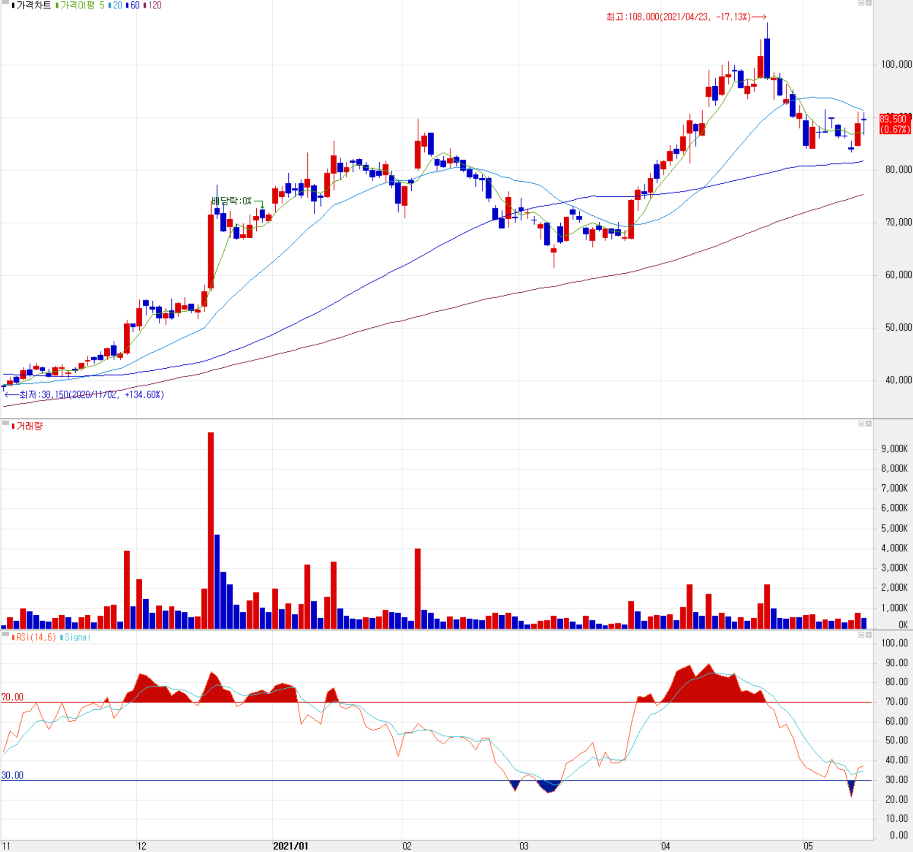 먼저 지난 4월 2일 작성한 2020년 결산 분석 글에서 개인적인 목표주가인 107,000원과 유사한 108,000원 최고가를 기록한 이후 당사의 주가는 시장 변동성에 따른 조정을 받다가 최근에는 90,000원 부근에서 등락을 하는 모습입니다. 2차전지 관련 대표기업인만큼 수급 주체 간 손바뀜이 잦은 모습을 보이고 있으며, 개인과 외국인이 매수우위를 보이고 있습니다. 차트 소견과 예상 실적에 기반한 개인적인 목표주가는 이전 107,000원에서 상향한 125,000원으로 설정하였습니다.