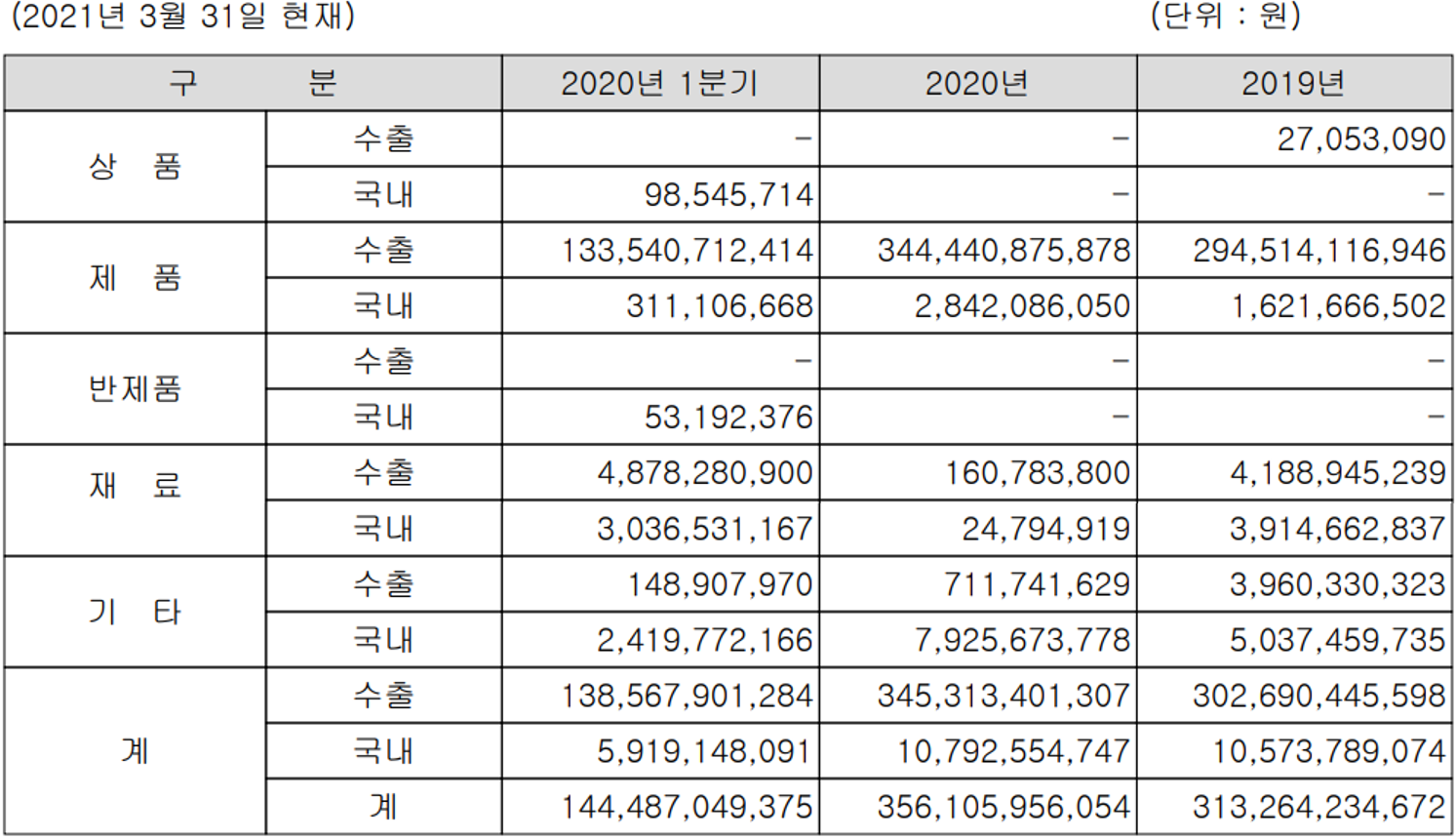 지난 1분기 기준 당사의 매출 구분에서는 수출과 내수의 비중이 각각 95%, 5%의 매출 비중을 나타내고 있습니다.