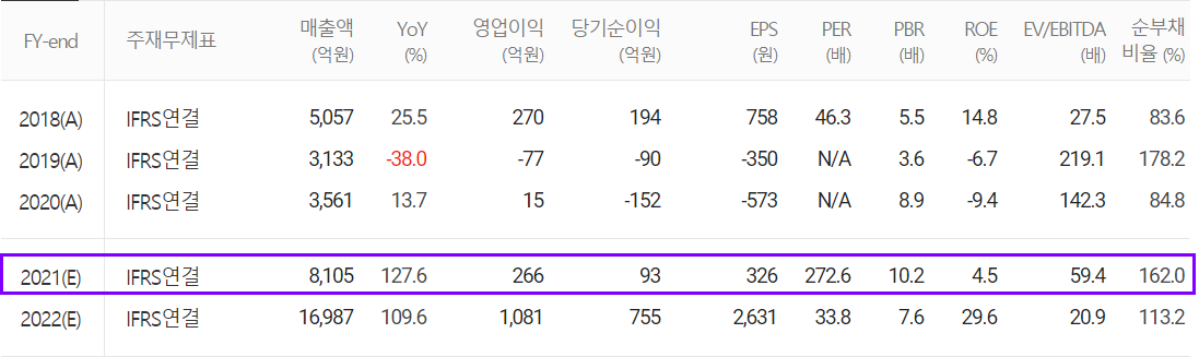 연간 예상 실적은 전방산업의 수요 증가와 당사의 설비 투자에 따라 변경되었으며, 매출액 8,105억 원으로 전년 대비 127.6% 증가, 영업이익 266억 원으로 1,673%, 당기순이익 93억 원으로 흑자 전환할 것으로 추정했습니다.