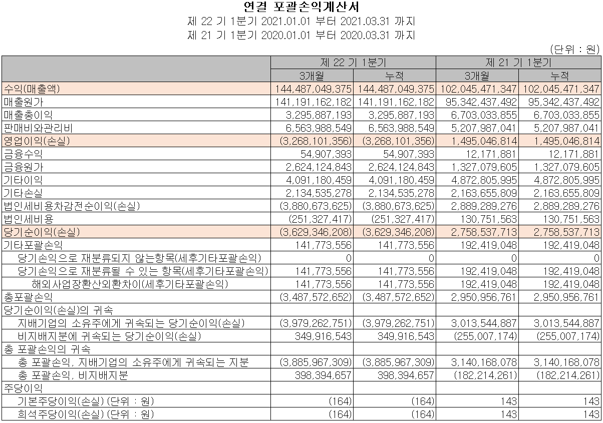 2021년 1분기 당사의 실적은 매출액 1,445억 원으로 전년 대비 41.6% 증가했고, 영업손실 33억 원, 당기순손실 36억 원을 기록하면서 적자 전환했습니다. 매출은 크게 증가했으나 전기차 향 양극재 공장 증설에 따른 감가상각비 반영 및 제조 부문 대규모 인력 채용 등에 따라 전년 동기 대비 매출원가 48.1%, 판관비 26%가 증가하면서 손실을 기록했습니다.