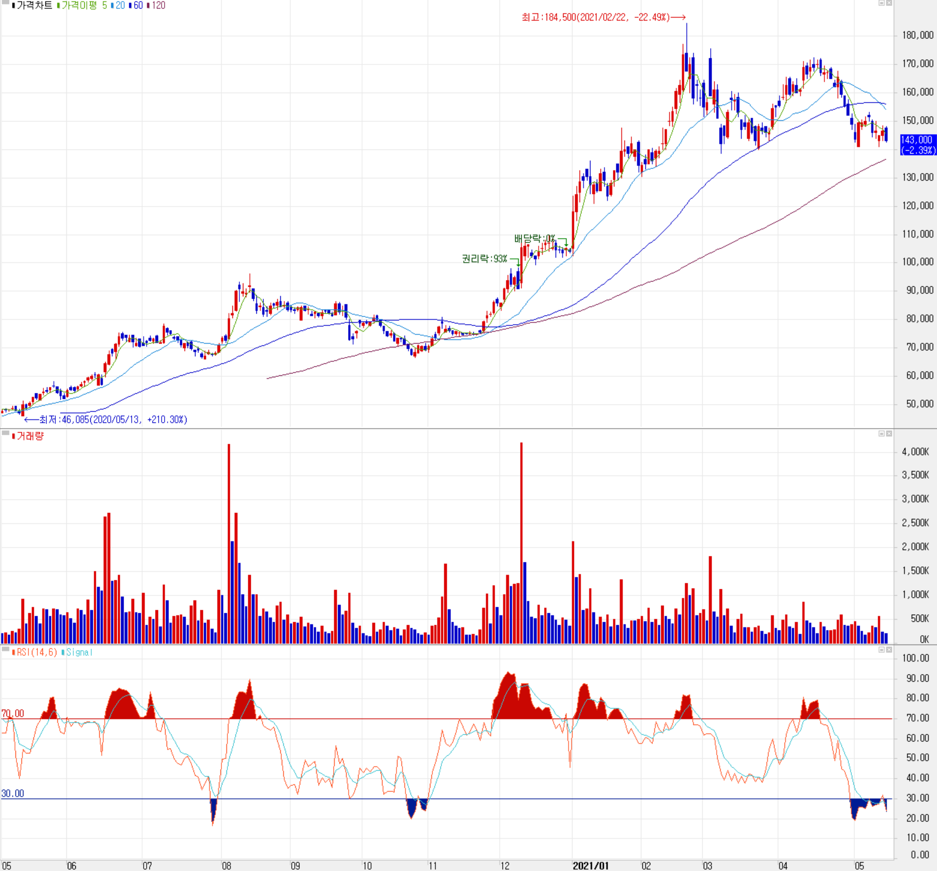 5월 17일 장 종료 기준 당사의 주가는 전 거래일보다 2.39% 내린 143,000원에 거래를 마쳤습니다. 외국인 비중은 7.73%이며, 시가 총액은 11조 772억 원으로 코스피 시총 상위 33위 종목입니다.