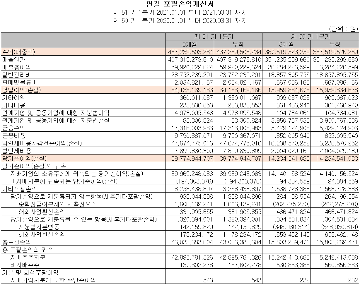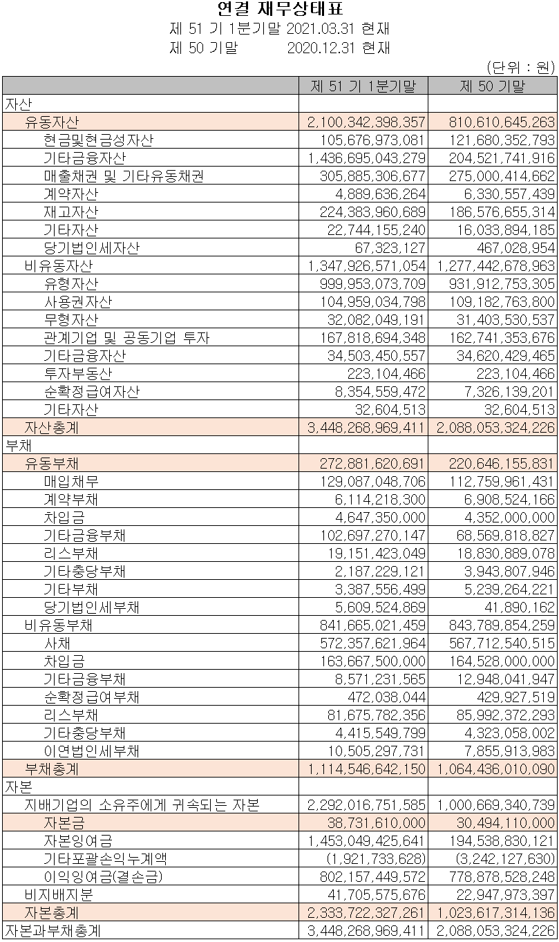 당사의 2021년 1분기 자산총계는 전기보다 65.1%(1조 3,602억) 늘어난 3조 4,483억 원으로 기타금융자산(당기 손익 공정가치 금융자산)의 증가에 기인합니다. 부채는 전기 대비 4.7%(501억) 증가한 1조 1,145억 원으로 매입채무와 금융부채의 증가가 주요 요인입니다.
