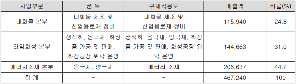 당사는 크게 내화물, 라임화성 및 2차전지 소재를 생산하는 에너지 소재 사업부문으로 구성되어 있습니다. 지난 1분기 내화물 본부의 매출은 1,159억 원으로 전체 매출의 24.8%를 차지하였고, 라임화성은 1,447억 원으로 31%, 에너지 소재 부문은 2,066억 원으로 44.2%의 매출 비중을 나타냈습니다.