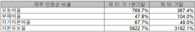 포스코케미칼 2021년 1분기 재무 안정성 비율에서는 유동비율 769.7%, 부채비율 47.8%, 자기자본비율 67.7%, 자본유보율 5,822.7%를 기록하면서 안정적인 재무구조를 유지하고 있습니다.