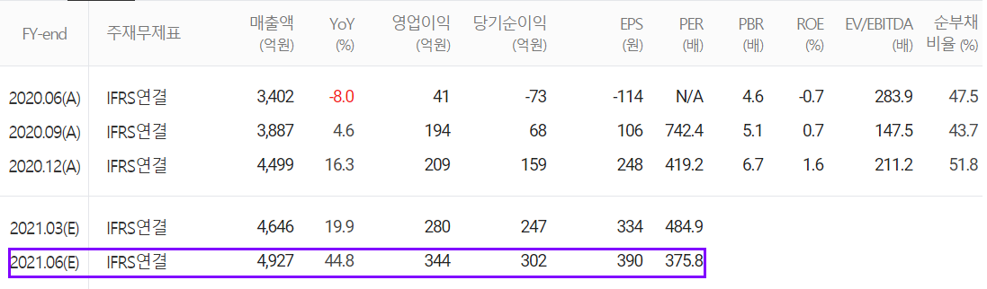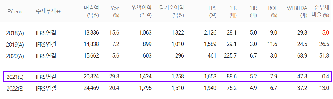 2021년 예상 실적은 매출액 2조 324억 원으로 전년 대비 29.8% 증가하고, 영업이익은 1,424억 원으로 136% 증가할 것으로 추정했습니다.
