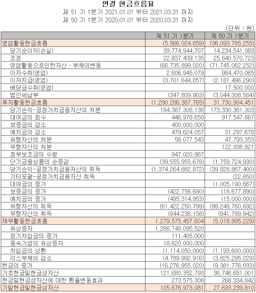 지난 1분기 영업활동 현금흐름은 영업활동으로 인한 부채(667억) 등으로 56억 원의 현금이 유출되었습니다. 당사 및 종속기업의 유상증자, 차입금 등을 조달하여 부채를 상환하였고, 유무형 자산에 투자하였습니다. 2021년 1분기 말 기준 현금 및 현금성 자산은 전기보다 282.4% 증가한 1,057억 원입니다.