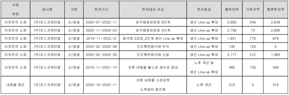 당사는 2019년부터 2차전지용 음극재 및 양극재 설비 증설 및 신설 투자를 지속적으로 수행하고 있습니다.