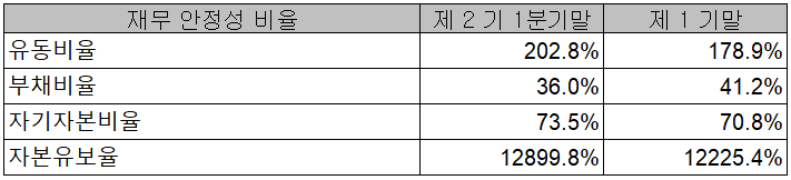 당사의 2021년 1분기 재무 안정성 비율에서는 유동비율 202.8%, 부채비율 36%, 자기자본비율 73.5%, 자본유보율 12,899.8%를 기록하면서 건실하고 안정적인 재무구조를 유지하고 있습니다.