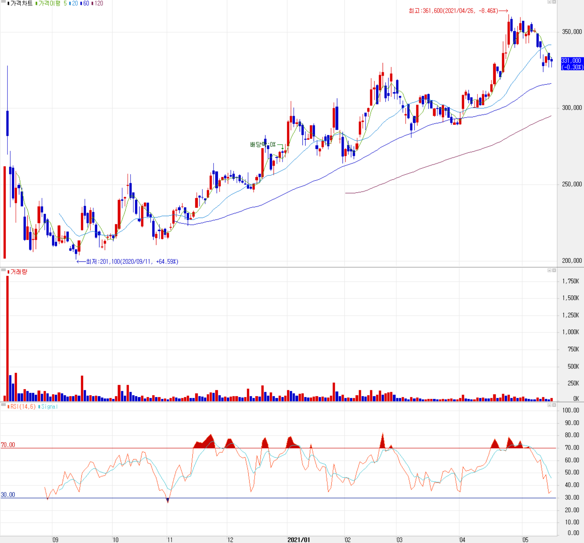 솔브레인 주가 추이(일봉: 2020.8 ~ 2021.05)
