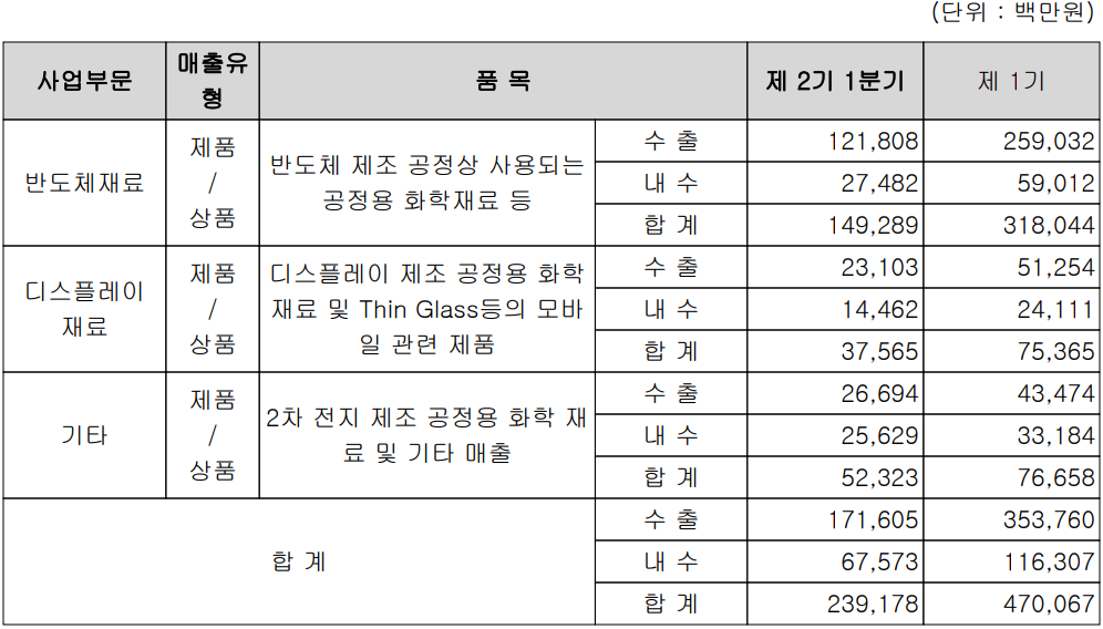 반도체 재료 부문의 매출에서 수출과 내수의 비중은 각각 81.6%, 18.4%를 기록했고, 디스플레이는 수출이 61.5% 내수가 38.5%를 차지하였습니다. 2차전지 전해액 등의 매출에서는 수출 51%, 내수 49%를 나타냈습니다. 참고로 상기 표에서 제1기의 기간은 2020.07.01 ~ 2020.12.31 (2개 분기)입니다.