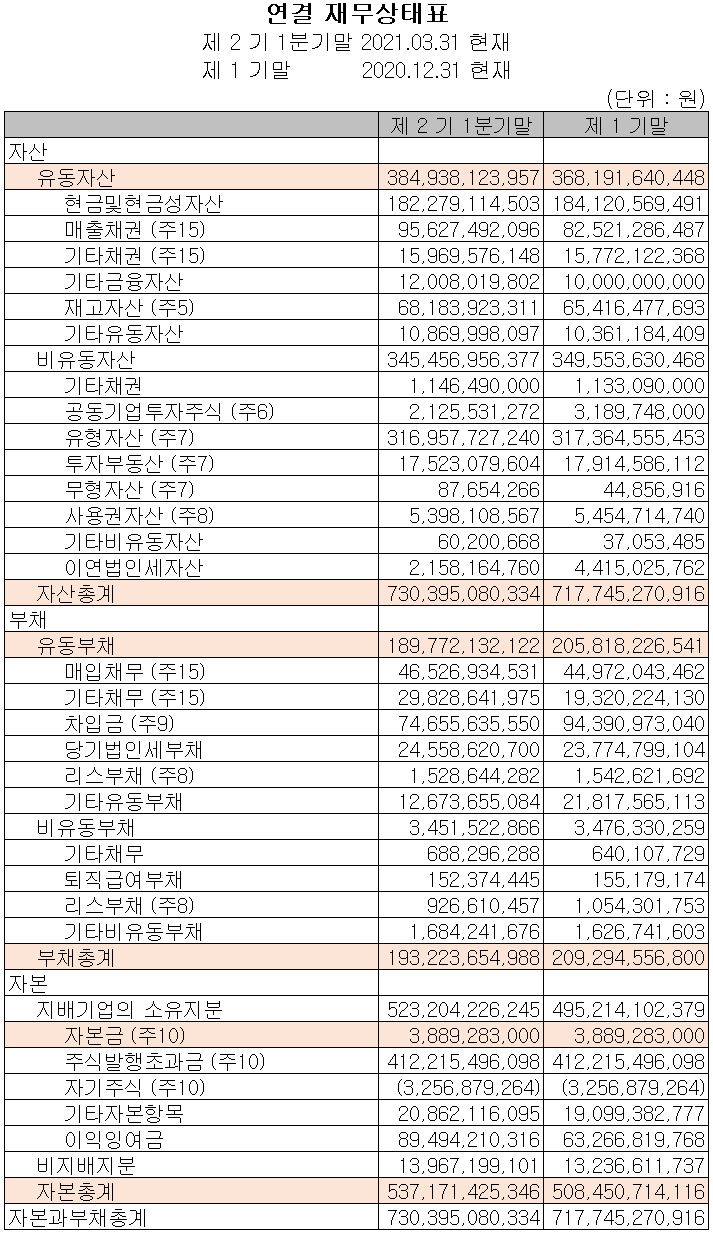 지난 1분기 말 기준 자산총계는 전기 대비 1.8% 증가한 7,304억 원으로 매출 채권과 재고 자산의 증가가 있었습니다. 부채는 7.7% 감소한 1,932억 원으로 차입금의 감소가 주요 요인입니다. 이익 증가에 따른 이익잉여금의 증가로 인해 총자본은 5.6% 증가한 5,372억 원을 기록했습니다.
