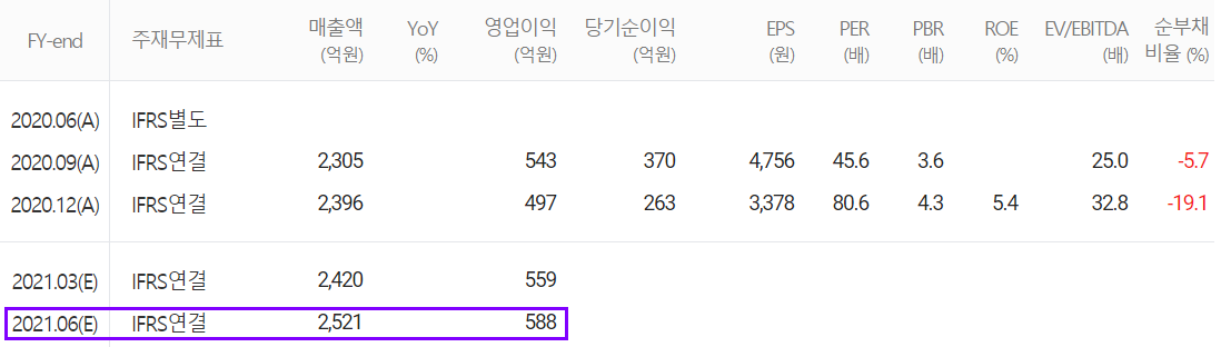 2021년 예상 실적은 매출액 1조 279억 원, 영업이익 2,429억 원 그리고 당기순이익은 1,866억 원을 달성할 것으로 보고 있습니다. 2020년 실적은 하반기만 반영된 것으로 절대비교는 의미 없는 것으로 생각되지만 전반적으로 2021년에는 전년 대비 1~20% 성장할 것으로 예상됩니다.