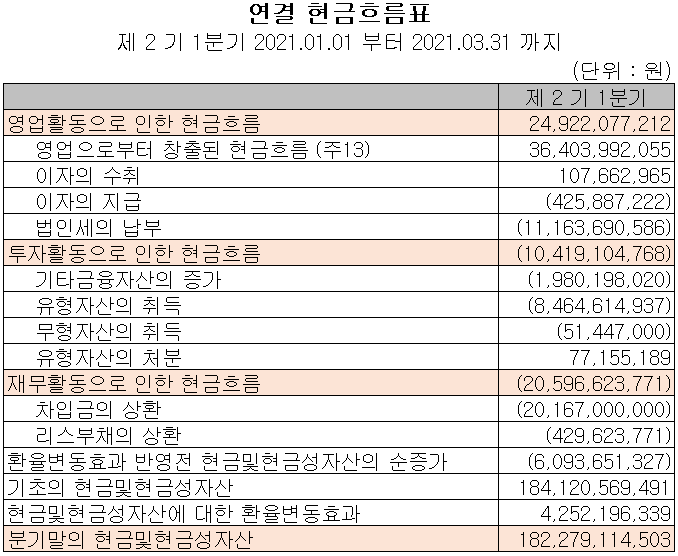 지난 1분기 영업활동 현금 흐름은 249억 원의 현금이 유입되었으며, 차입금 등 부채를 상환했고 유무형 자산의 투자를 진행하였습니다. 2021년 1분기 말 현재 현금 및 현금성 자산은 1,823억 원입니다.