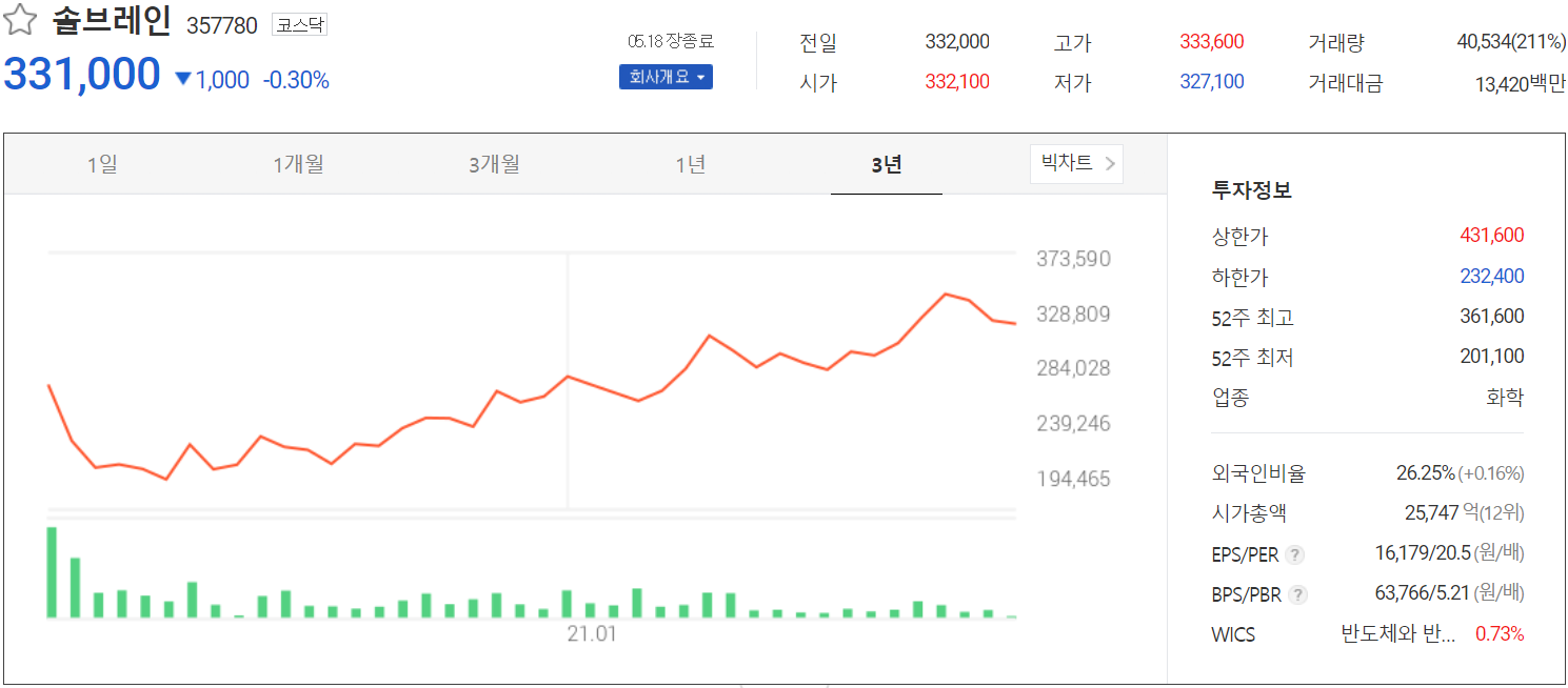 5월 18일 장종료 기준 주가는 전 거래일보다 0.3% 내린 331,000원에 거래를 마쳤습니다. 외국인 비중은 26.25%이며, 시가 총액 2조 5,747억 원으로 코스닥 시총 12위 종목입니다.