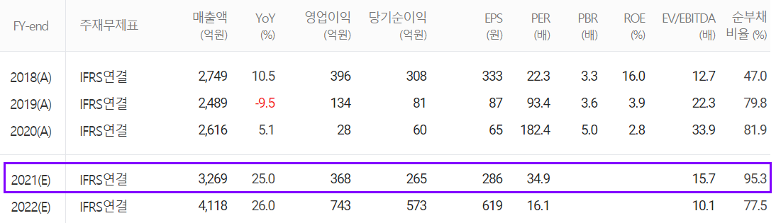 2021년 예상 실적에서는 매출액 3,269억 원으로 전년보다 25% 증가하고, 영업이익은 368억 원으로 1,214% 증가할 것으로 추정했습니다. 2차전지 소재 생산을 위한 중국 공장의 증설과 폴란드 공장의 가동으로 실적이 개선될 것으로 전망하고 있습니다.