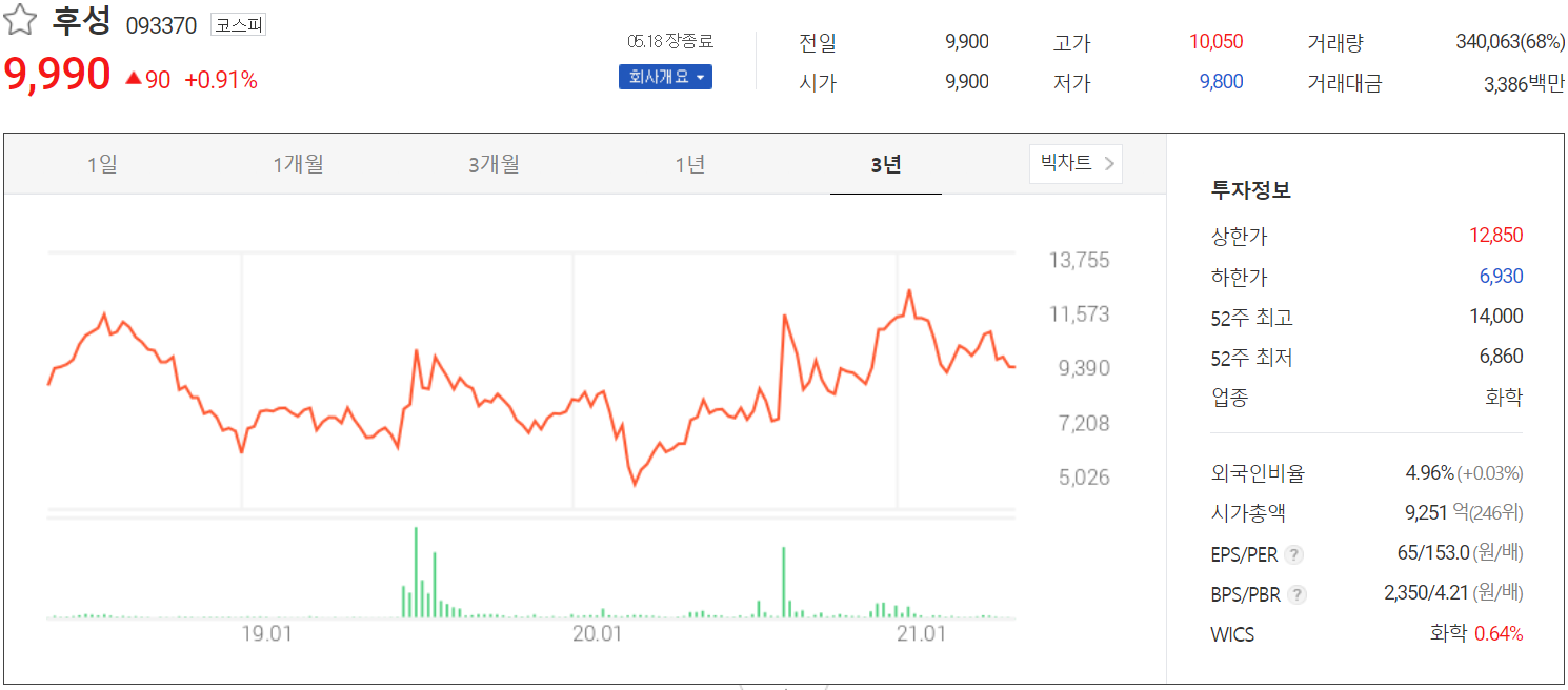 5월 18일 장종료 기준 당사의 주가는 전 거래일보다 0.91% 증가한 9,990원에 거래를 마쳤습니다. 외국인 비중은 4.96%이며, 시가 총액 9,251억 원으로 코스피 시총 246위 종목입니다.