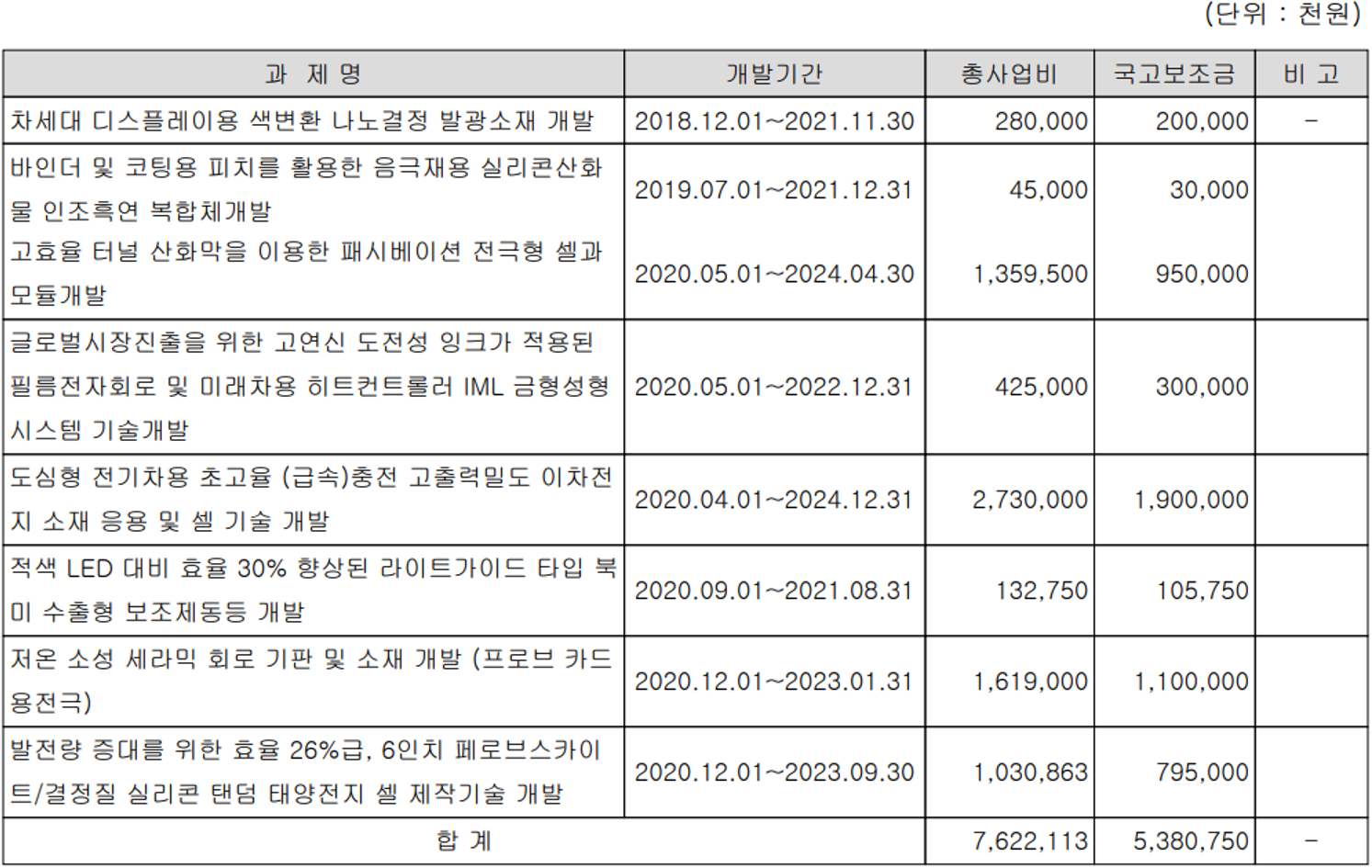 주요 연구과제로는 디스플레이 발광 소재, 2차전지 및 태양전지 소재 등이 있습니다.